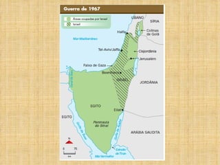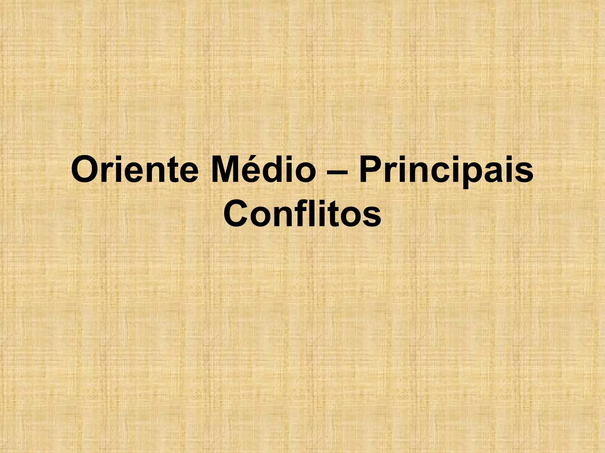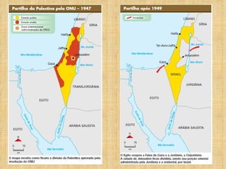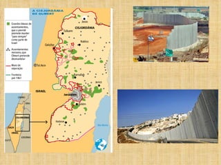 O documento resume os principais conflitos no Oriente Médio relacionados à Questão Palestina, desde o domínio hebreu da Palestina há mais de 1200 a.C. até os impasses atuais sobre a criação de um Estado Palestino, divisão de Jerusalém e status dos refugiados e colonatos judaicos.