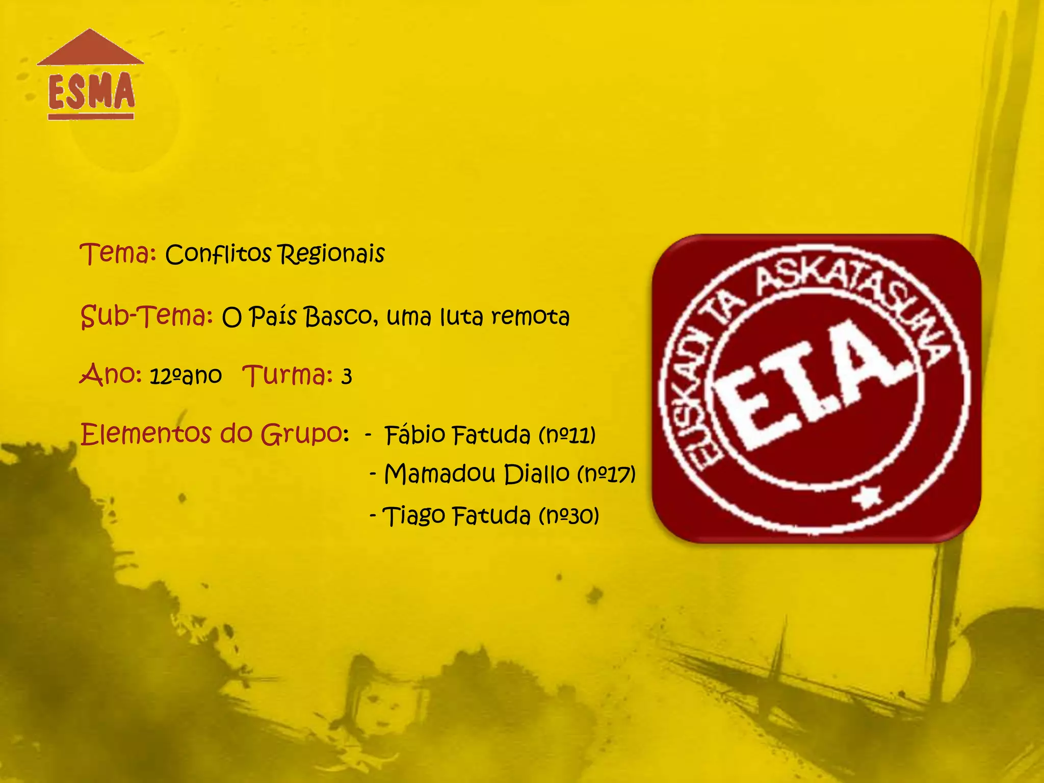 [1] O documento discute o conflito histórico entre o País Basco e a Espanha, com o povo basco lutando por independência por séculos através de grupos como o PNV e a ETA. [2] A ETA emergiu na ditadura de Franco e usou táticas violentas em sua campanha, mas recentemente declarou um cessar-fogo. [3] Embora o conflito tenha diminuído, o nacionalismo basco e o desejo de autonomia permanecem importantes para a identidade do povo