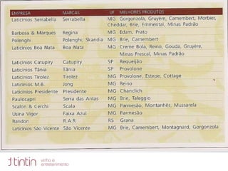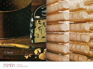 O documento fornece informações sobre queijos e vinhos. Apresenta definições de queijo, estilos de queijos, propriedades do leite de vaca, nomes e regiões de produção de queijos famosos. Também discute a arte da degustação de vinho e fornece detalhes sobre harmonização de queijos e vinhos.