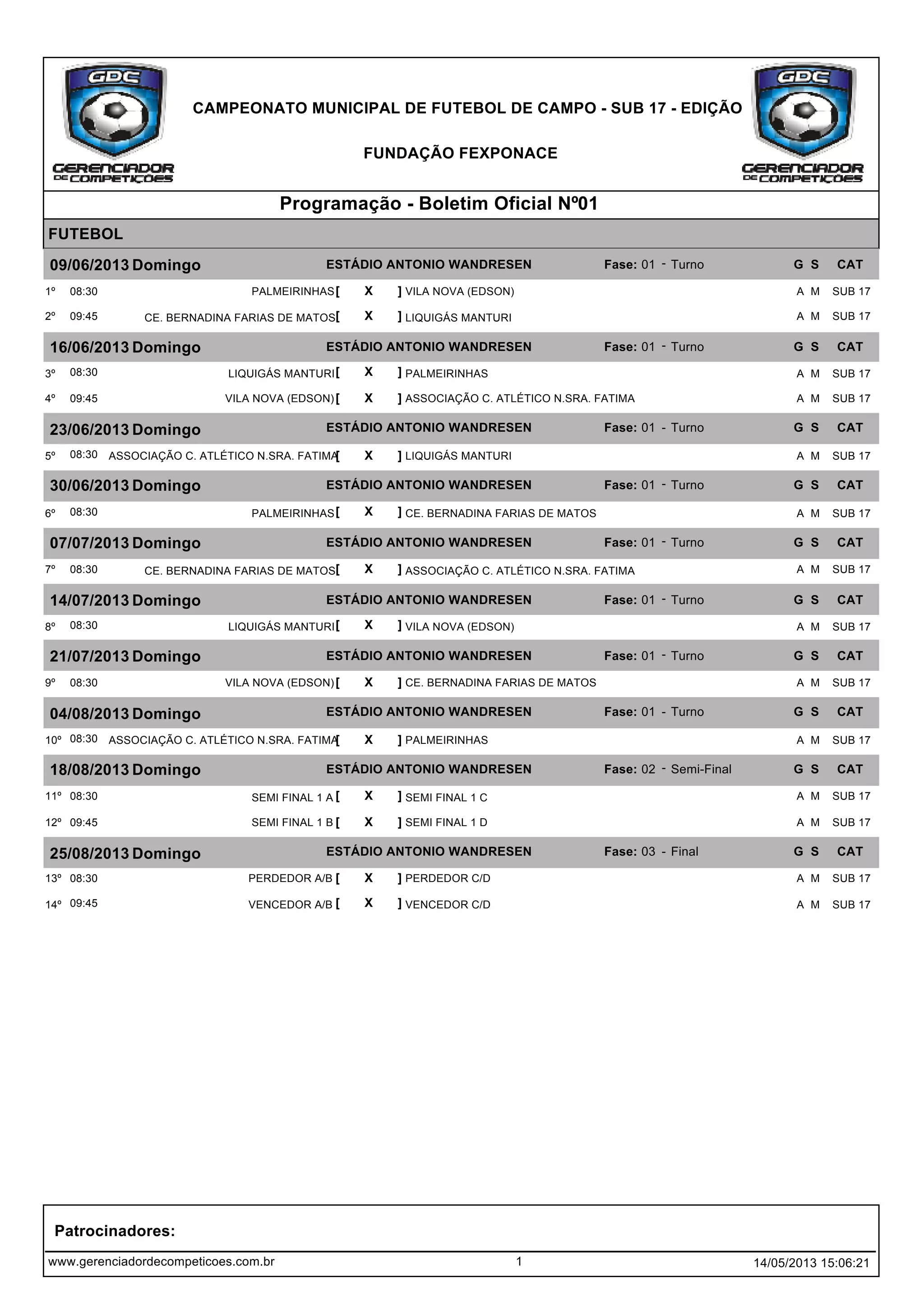 O documento apresenta a programação do Campeonato Municipal de Futebol de Campo Sub 17, com as datas e horários dos jogos nas fases de turno, semi-finais e final, que serão realizados no Estádio Antonio Wandersen. Participarão 8 equipes divididas em dois grupos para a fase inicial.