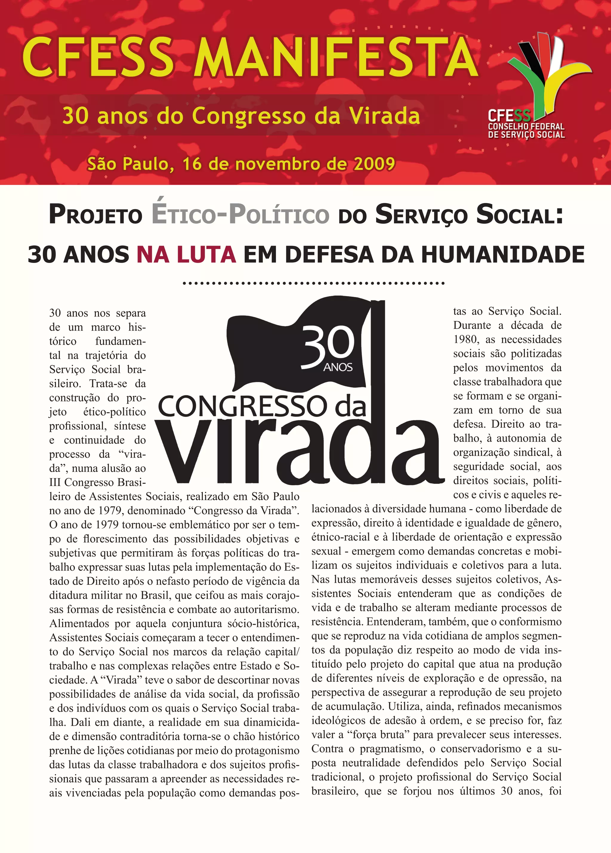 O documento descreve o projeto ético-político do Serviço Social brasileiro que se desenvolveu nos últimos 30 anos a partir do III Congresso Brasileiro de Assistentes Sociais em 1979. O projeto se baseia na luta por liberdade, trabalho e direitos humanos contra o capitalismo e em defesa dos interesses dos trabalhadores. Ao longo dos anos, o projeto aprimorou seu arcabouço teórico e ético para enfrentar os desafios atuais de desigualdade social.