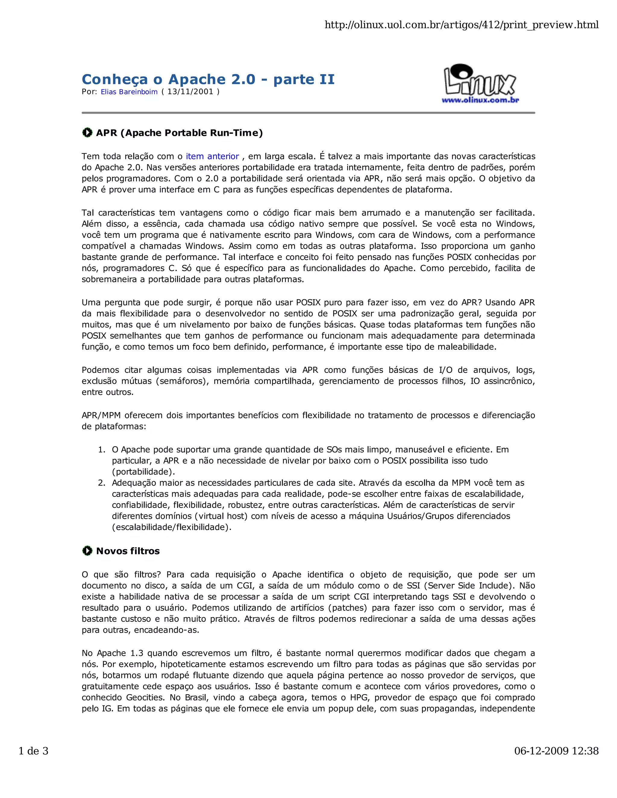1) O documento descreve novas características do Apache 2.0, incluindo APR (Apache Portable Run-Time) que melhora a portabilidade, novos filtros que permitem encadear processamento de requisições, e Piped Logs que melhoram o desempenho e gerenciamento de logs.