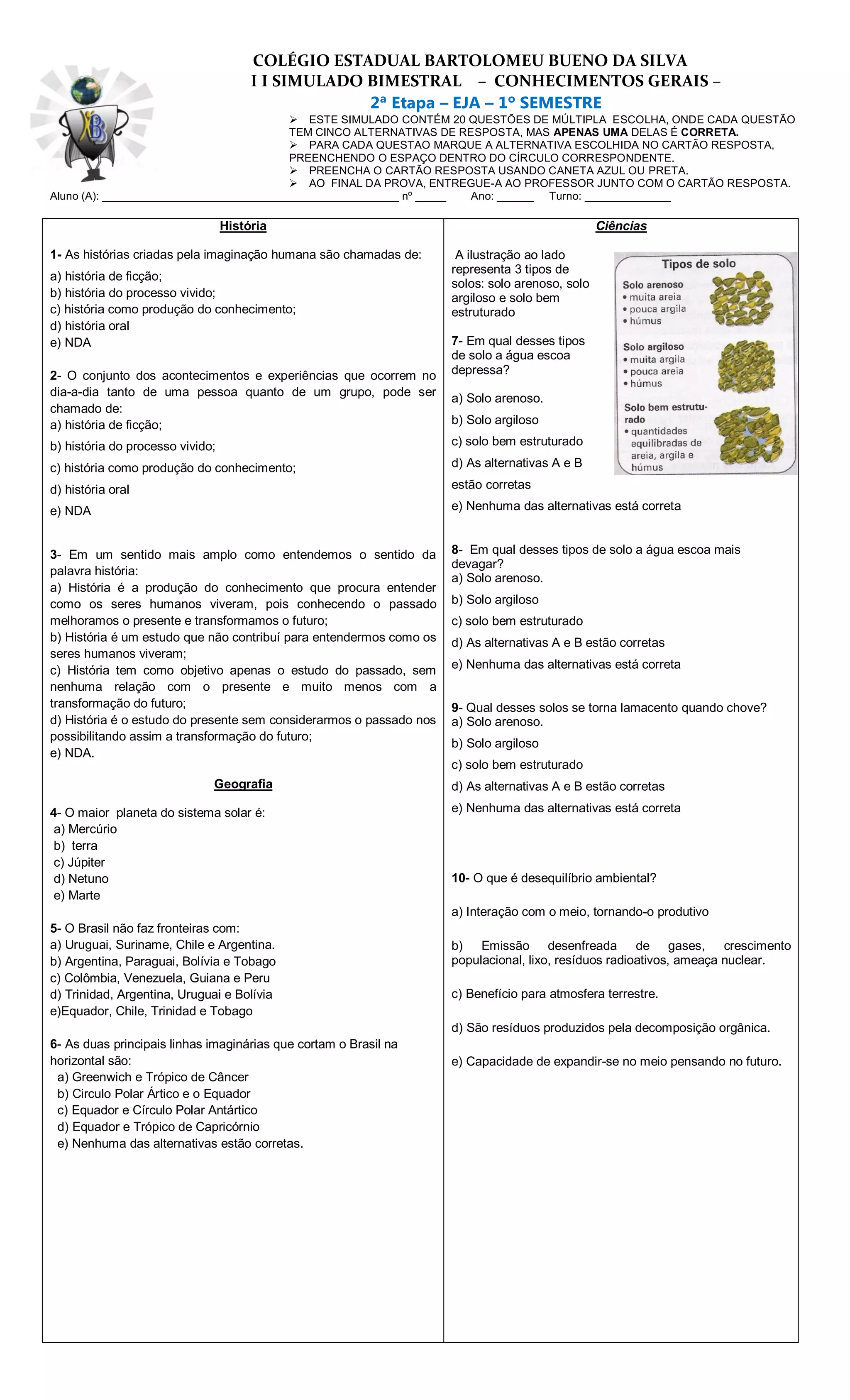 A prova contém 20 questões de múltipla escolha sobre diversos assuntos como História, Geografia, Ciências, Inglês, Educação Física, Arte, Educação Religiosa. O texto fornece instruções sobre como preencher o cartão de respostas e informa que o aluno deve entregar a prova e o cartão ao professor após a conclusão.