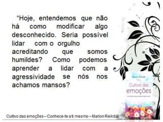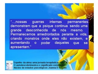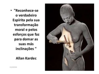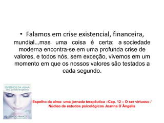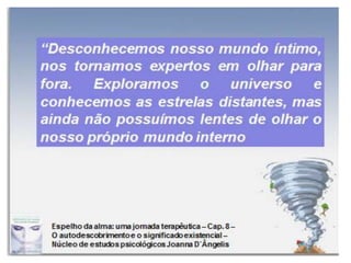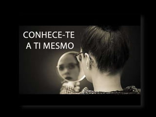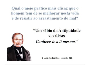 O documento discute a crise de valores na sociedade moderna e a necessidade de autoconhecimento e transformação moral. Também aborda o Oráculo de Delfos na Grécia Antiga e como a busca por respostas externas não traz realização interior. A conclusão é que o autoconhecimento através do Espiritismo possibilita assumir compromissos de mudança e abandonar velhos hábitos.