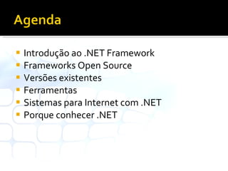 O documento introduz o .NET Framework, descrevendo sua história, propósito e principais componentes. Foi criado para permitir o desenvolvimento multiplataforma com código gerenciado e suporta diversas linguagens. Inclui o Common Language Runtime, bibliotecas de classes e ferramentas como o Visual Studio. Projetos como o Mono permitem que .NET seja usado em sistemas open source.