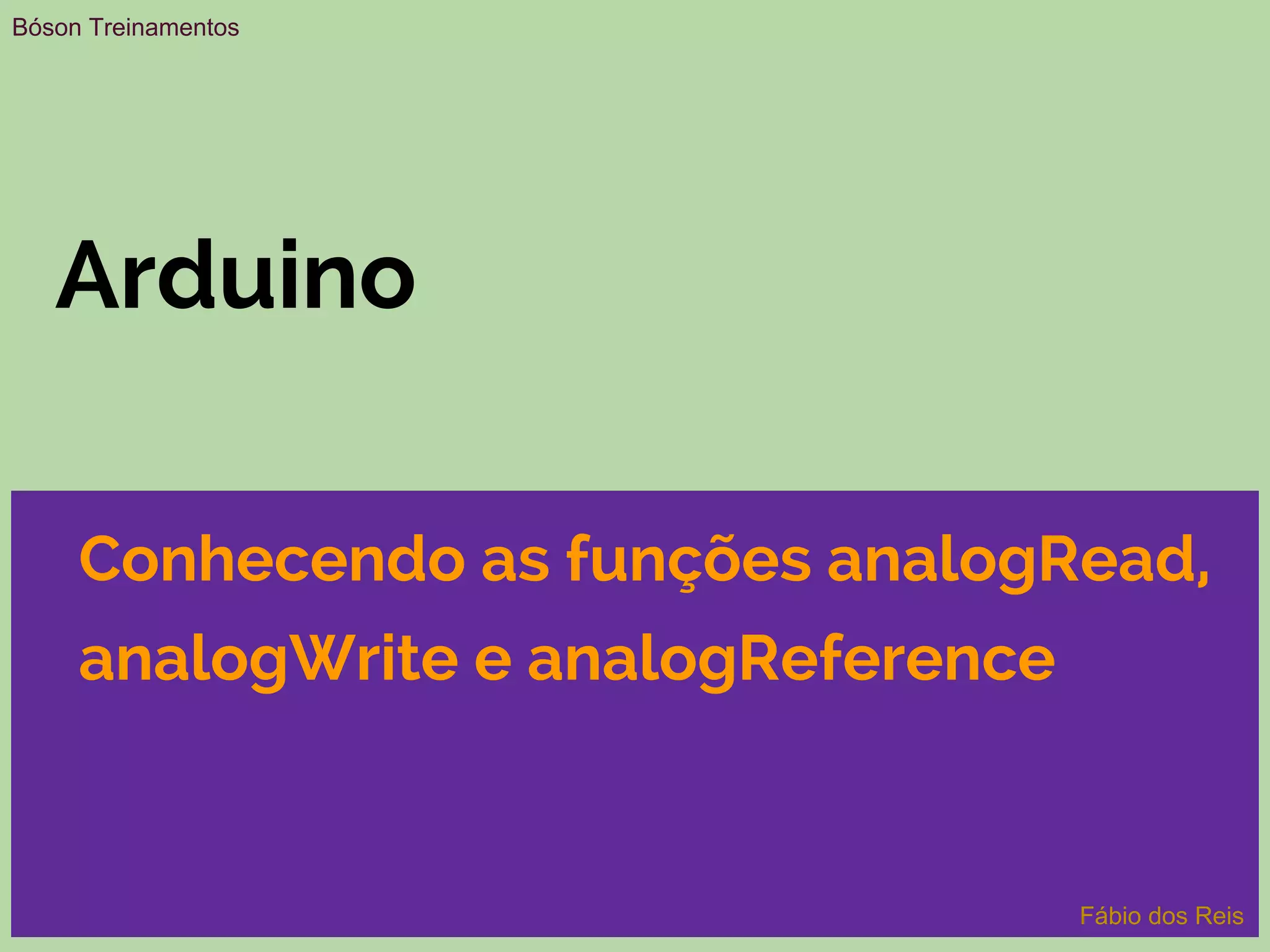 O documento descreve as funções analogRead(), analogWrite() e analogReference() do Arduino. A função analogRead() lê valores de pinos analógicos, analogWrite() gera sinais PWM em pinos digitais e analogReference() configura a tensão de referência para leituras analógicas.