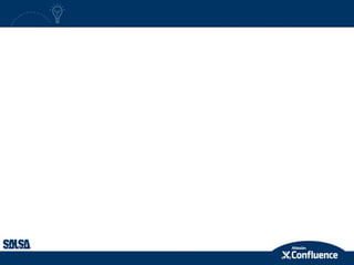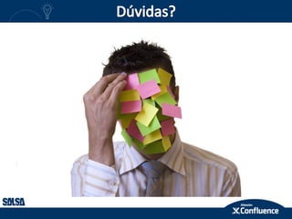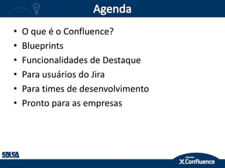 O documento descreve as funcionalidades do Confluence, incluindo criação de conteúdo colaborativo, compartilhamento de arquivos e notas de reunião. Também discute como o Confluence pode integrar-se com o Jira para gerenciamento de projetos e requisitos, e como permite a publicação de documentação para clientes.