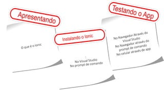 O documento descreve como construir aplicativos móveis híbridos usando o framework Ionic. Ele explica o que é o Ionic, como instalá-lo no Visual Studio ou no prompt de comando, como iniciar um novo projeto neles, e como testar o aplicativo no navegador, emulador ou diretamente no celular.
