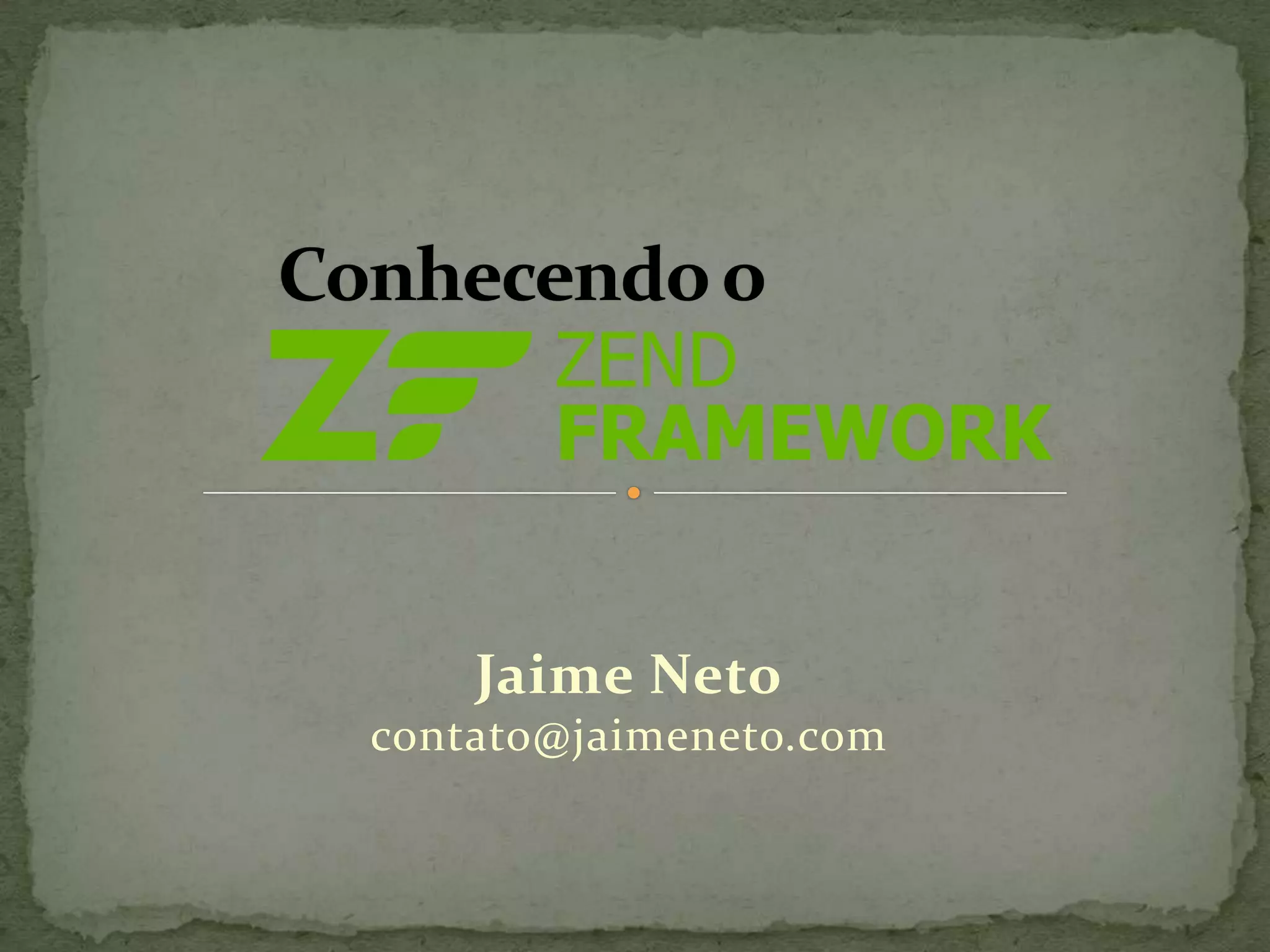 Jaime Neto apresenta sobre o framework PHP Zend Framework. Ele discute os principais componentes e estruturas do Zend Framework, incluindo modelos, controladores, visões e formulários. Ele também fornece exemplos de código para ilustrar o uso de vários componentes como acesso a banco de dados, rotas e controllers.