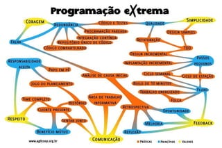 XP é uma metodologia ágil que prioriza indivíduos e colaboração com o cliente para entregar software de qualidade de forma rápida e contínua. Ela defende comunicação face a face, programação em par, ciclos de feedback curtos e desenvolvimento guiado por testes.