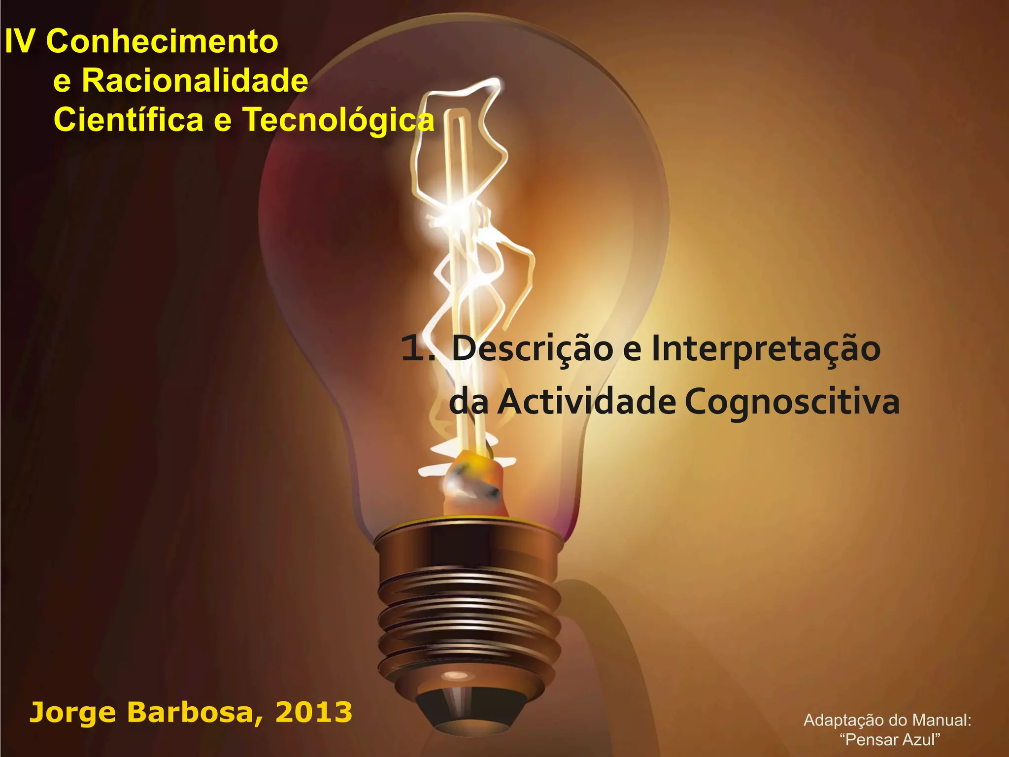 O documento discute a natureza do conhecimento e da mente. Apresenta duas perspectivas: a monista, que defende que a mente é parte do mundo físico e reduz-se à atividade cerebral, e a dualista, que defende a existência de matéria e espírito como princípios distintos da realidade. Discute-se se os pensamentos e experiências são apenas processos bioquímicos cerebrais ou se a mente é algo mais do que a atividade neurológica.
