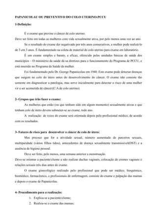 O documento fornece informações sobre o exame de Papanicolaou (PCCU), incluindo sua definição, objetivo de prevenir câncer de colo uterino, grupos que devem realizá-lo, fatores de risco, procedimento, resultados possíveis e significados, achados bacteriológicos comuns e anormais, e detalhes sobre células cervicais anormais e o papel do HPV no desenvolvimento de câncer de colo uterino.