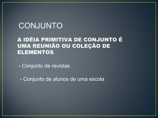 O documento descreve conceitos básicos de conjuntos numéricos e suas operações. Ele define o que é um conjunto, formas de representá-lo e tipos como finito, infinito e vazio. Também explica as relações entre conjuntos como inclusão, igualdade, subconjunto, união, interseção e diferença. Por fim, apresenta exemplos de conjuntos numéricos como naturais, inteiros, racionais, irracionais e reais.