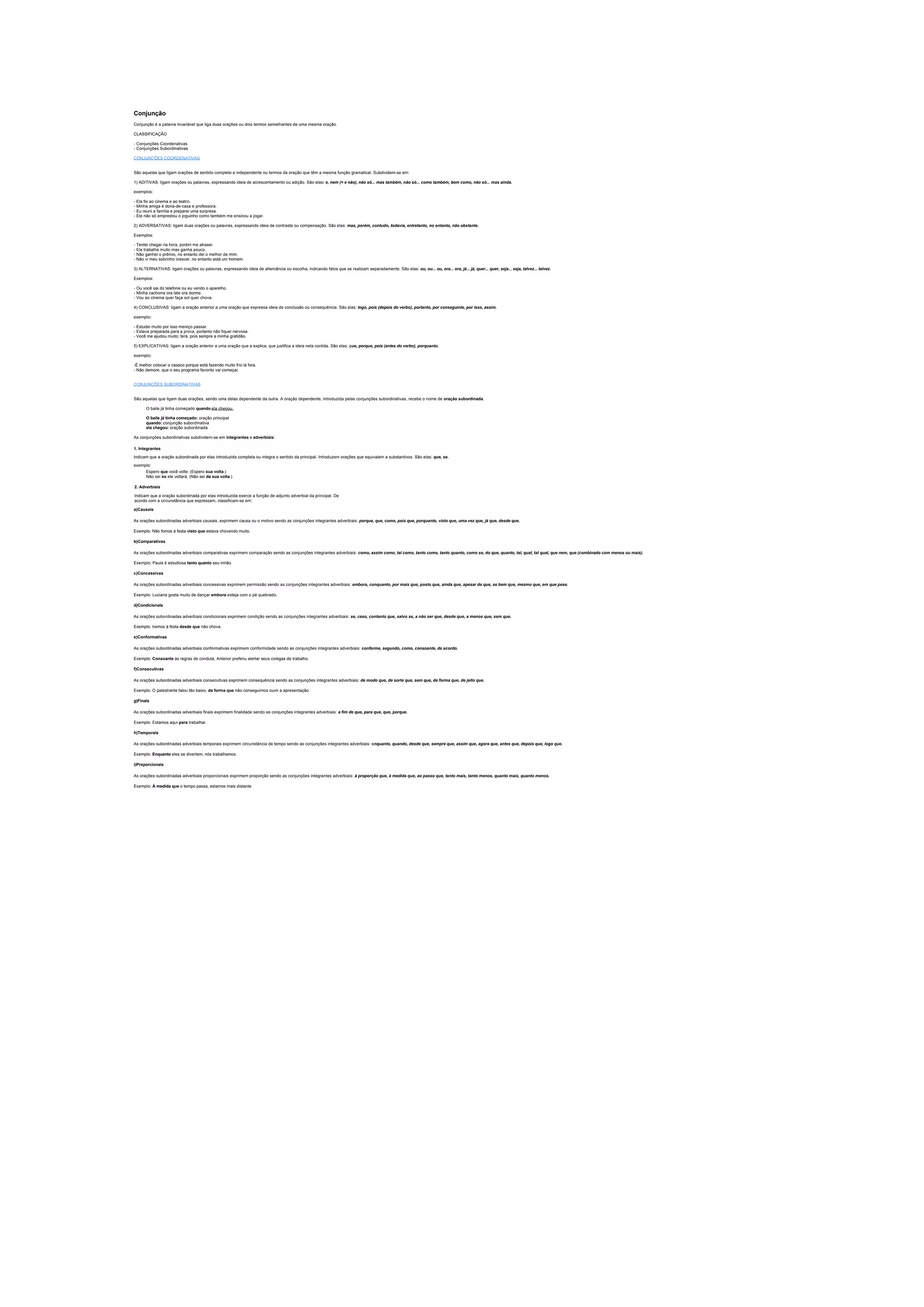 O documento classifica e explica os tipos de conjunções no português. Descreve conjunções coordenativas, que ligam orações independentes, e subordinativas, que ligam uma oração principal a uma dependente. Detalha cinco tipos de coordenativas (aditivas, adversativas, alternativas, conclusivas, explicativas) e nove tipos de subordinativas (causais, comparativas, concessivas, condicionais, conformativas, consecutivas, finais, temporais, proporcionais).