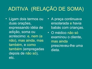 O documento descreve as principais conjunções coordenativas no português, dividindo-as em cinco categorias: aditiva, adversativa, alternativa, conclusiva e explicativa. Cada categoria relaciona orações de uma determinada forma, como expressando adição, oposição, alternância, conclusão ou explicação. Exemplos ilustram o uso de cada conjunção dentro de sua respectiva categoria gramatical.