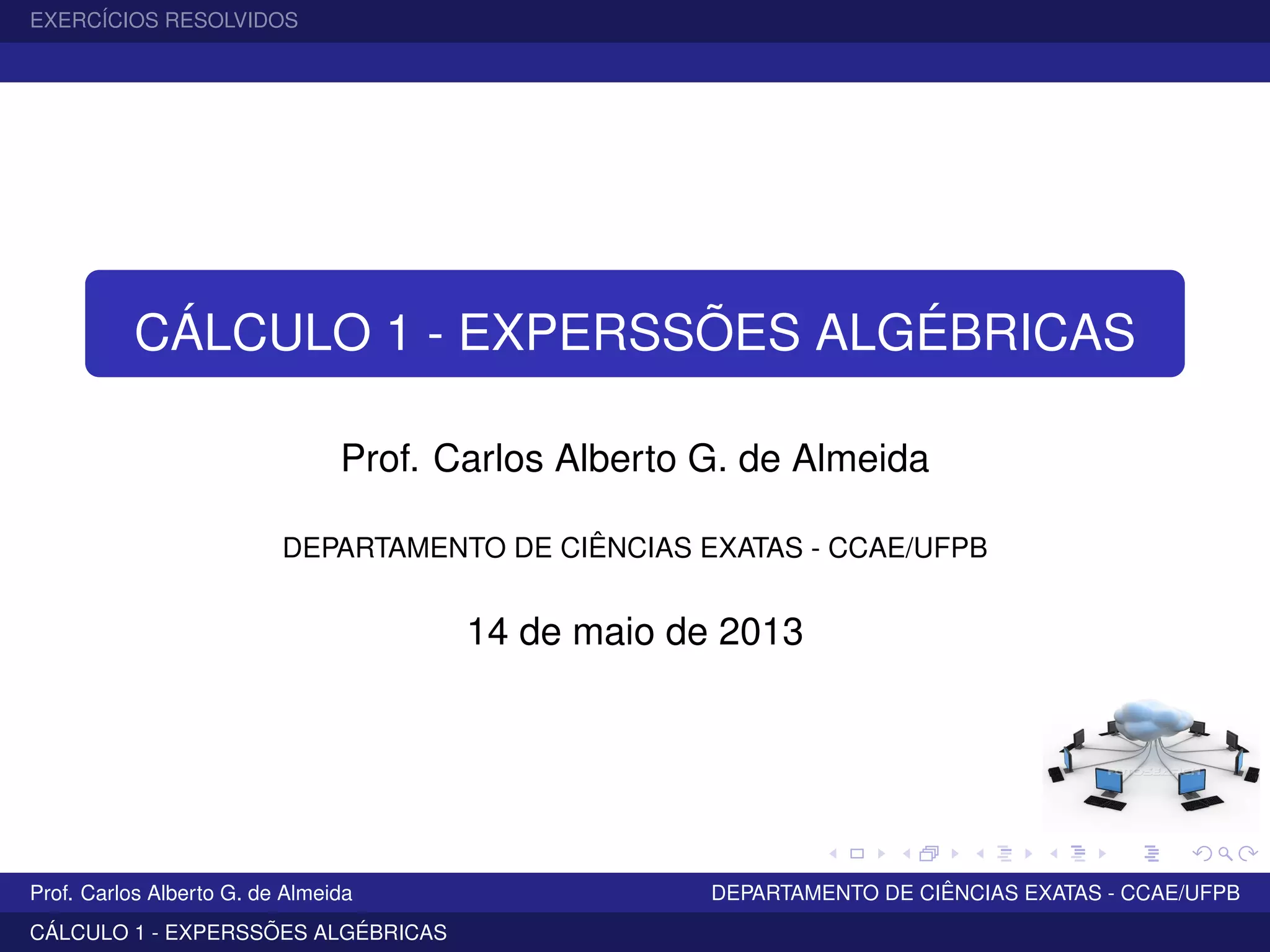 O documento apresenta exercícios resolvidos sobre expressões algébricas, incluindo expressões polinomiais, racionais e radiciação. O documento discute identidades envolvendo adição, subtração, produto e divisão, e fornece exemplos resolvidos destas operações com expressões algébricas. Finalmente, o documento apresenta exercícios para o leitor praticar estas operações.