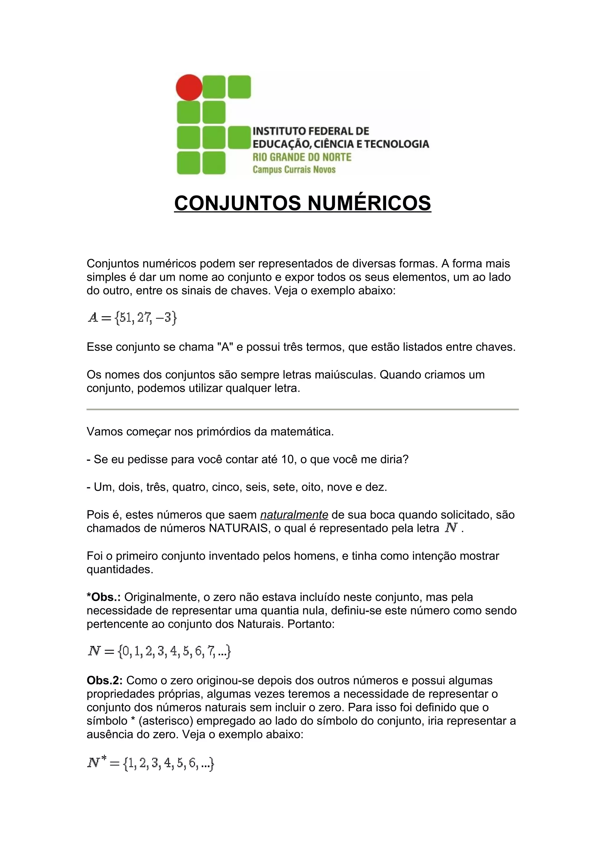 O documento descreve os principais conjuntos numéricos: