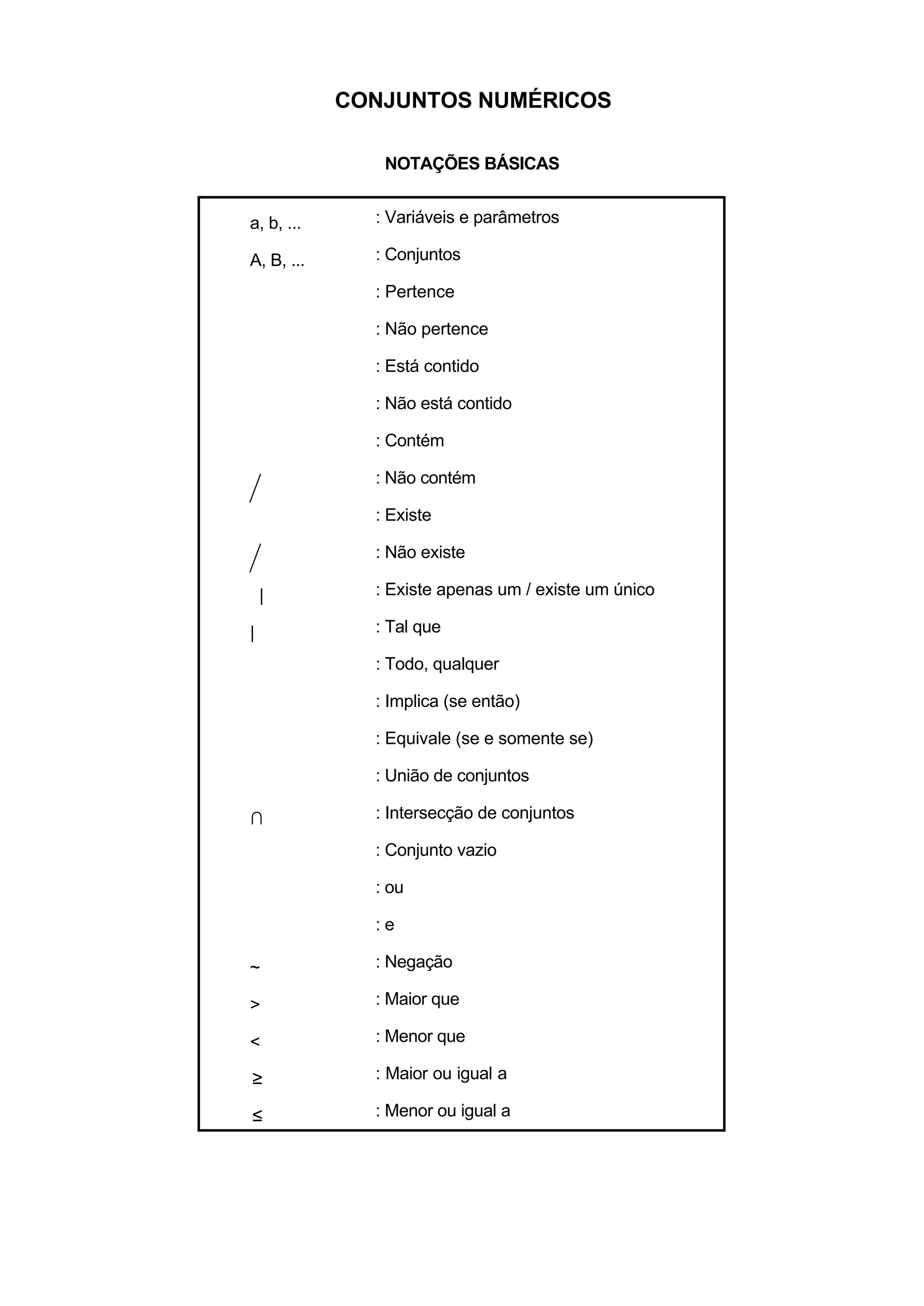 O documento apresenta as principais notações e propriedades dos conjuntos numéricos. Define os conjuntos dos números naturais, inteiros, racionais e irracionais e sua união no conjunto dos números reais. Apresenta as operações básicas de adição, subtração, multiplicação e divisão nesses conjuntos e suas propriedades. Por fim, fornece exemplos numéricos ilustrativos.