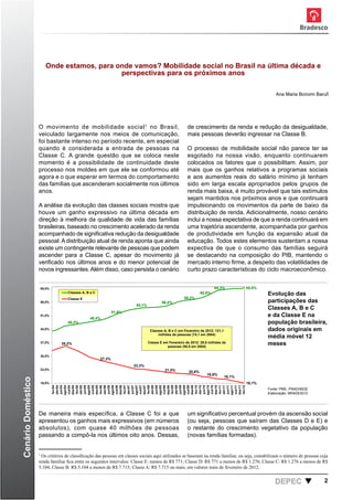 O movimento de mobilidade social no Brasil, especialmente a entrada de pessoas na classe C, foi intenso na última década, resultando em melhorias na qualidade de vida e na redução da desigualdade. As perspectivas indicam que, se o crescimento da renda e a redução da desigualdade continuarem, mais pessoas poderão ascender à classe B. Contudo, a incerteza global e a recessão em países como a Espanha impactarão o clima econômico, elevando a cautela dos agentes internacionais.