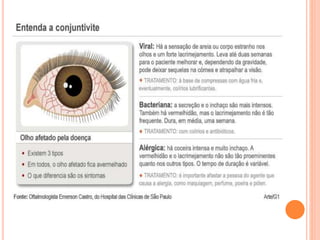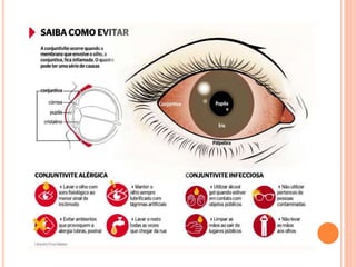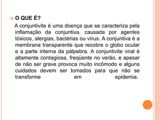 A conjuntivite é uma inflamação da membrana que recobre o olho e pálpebra, causada por vírus, bactérias ou alergias. Os sintomas incluem olho vermelho, lacrimejante e sensível à luz. O tratamento envolve compressas frias, limpeza dos olhos e colírios lubrificantes para aliviar os sintomas, além de medidas para evitar a propagação.
