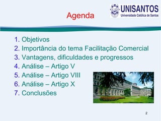 1. O documento discute os aspectos legais e econômicos do Acordo de Facilitação Comercial da OMC, analisando os Artigos V, VIII e X do GATT 1994. 2. Apresenta as principais vantagens, dificuldades e progressos no tema da facilitação do comércio. 3. Discutem propostas de melhorias nos artigos, incluindo redução de taxas e formalidades para importação e exportação no Brasil.