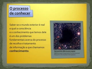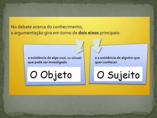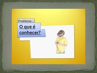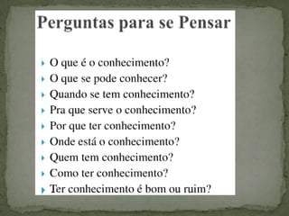 O documento discute o conceito de conhecimento como a relação entre sujeito e objeto. Aborda diferentes tipos de intuição como formas de obter conhecimento e descreve a teoria do "cogito" de Descartes como a primeira verdade indubitável. Também discute a noção de verdade, critérios de verdade e a capacidade humana de consciência e autoconhecimento.