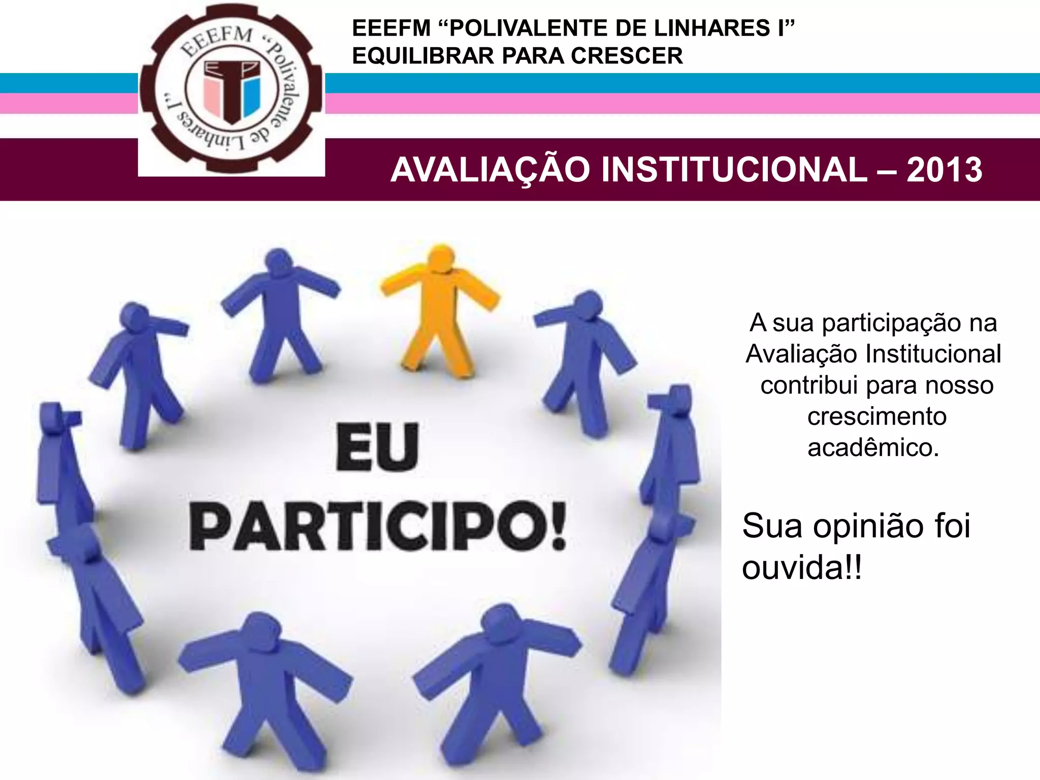 Este documento resume os resultados de uma avaliação institucional realizada na EEEFM "Polivalente de Linhares I" em 2013. Os itens avaliados incluíram o JPP, estudos e planejamentos, sistema de avaliação, teste de conhecimentos integrados, prova específica, pré-conselho e conselho de classe. A maioria dos itens recebeu avaliações positivas, com sugestões para aperfeiçoar planejamentos, distribuição de pontos extras e simulados do ENEM.