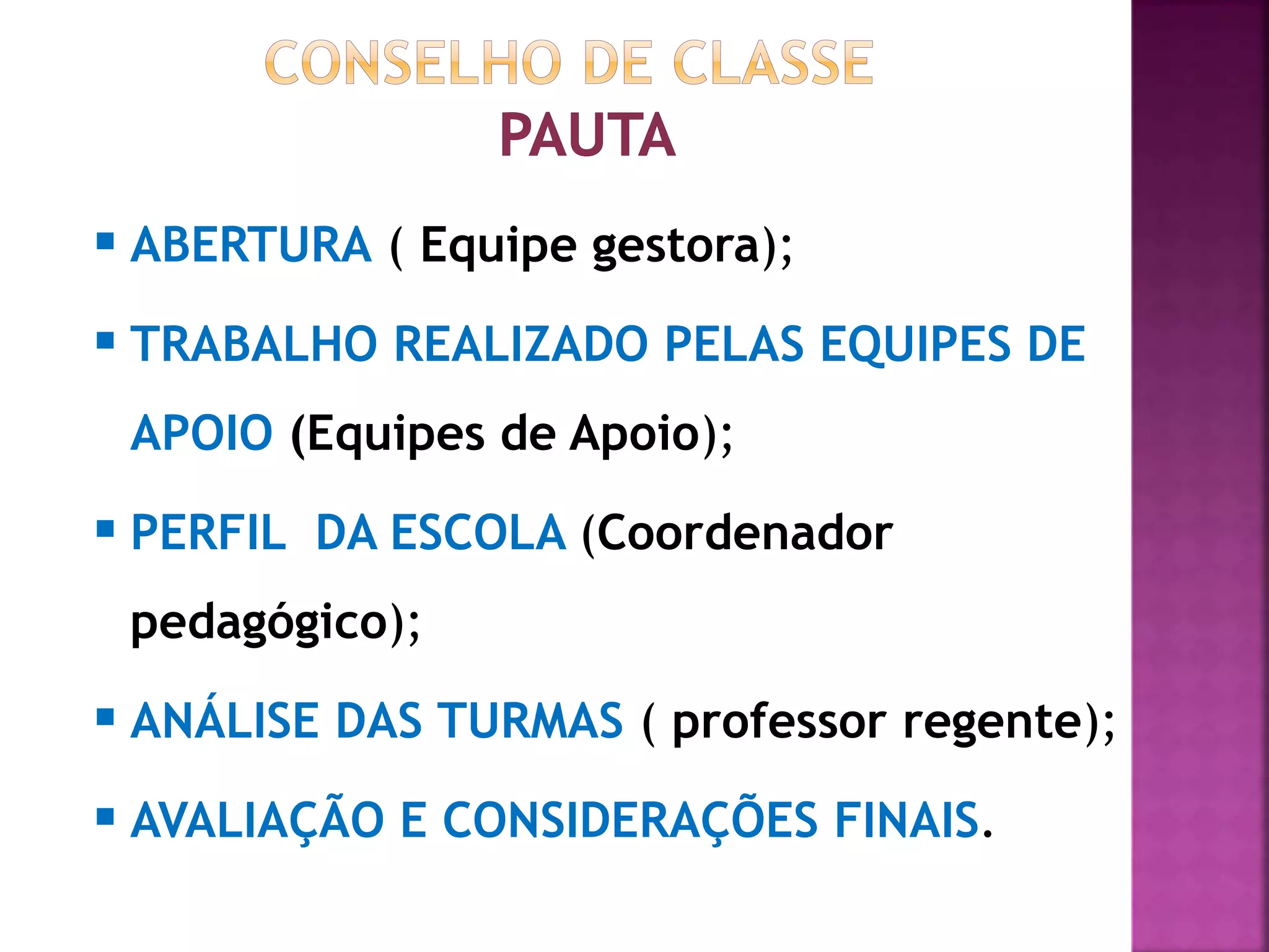 O documento descreve as etapas de uma reunião de conselho de classe: 1) a abertura feita pela equipe gestora; 2) o trabalho das equipes de apoio; 3) o perfil da escola apresentado pelo coordenador pedagógico; 4) a análise das turmas pelos professores; 5) a avaliação e considerações finais.