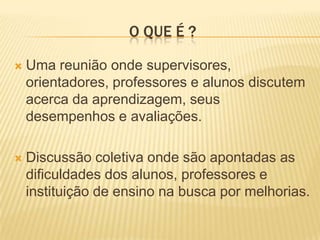 O documento discute o que é um conselho de classe, definindo-o como uma reunião onde professores, orientadores e alunos discutem o desempenho e aprendizagem dos alunos para melhorar o processo de ensino-aprendizagem. O documento também descreve os objetivos, participantes e benefícios de um conselho de classe.