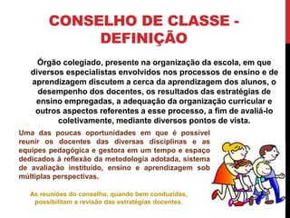 O documento discute o Conselho de Classe como uma oportunidade para reflexão sobre a aprendizagem dos alunos e o trabalho docente. Ele define o Conselho de Classe, explica seus objetivos de compartilhar informações e propor melhorias, e destaca a importância da participação de professores, coordenação e direção na discussão sobre o desempenho dos alunos e professores.