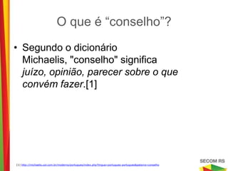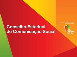 O documento discute a proposta de criação do Conselho Estadual de Comunicação Social (CECS) no Rio Grande do Sul. Aborda a composição sugerida para o conselho, seus objetivos de promover a participação social na comunicação e a democratização do acesso, e os valores de democracia e transparência que devem nortear sua atuação.