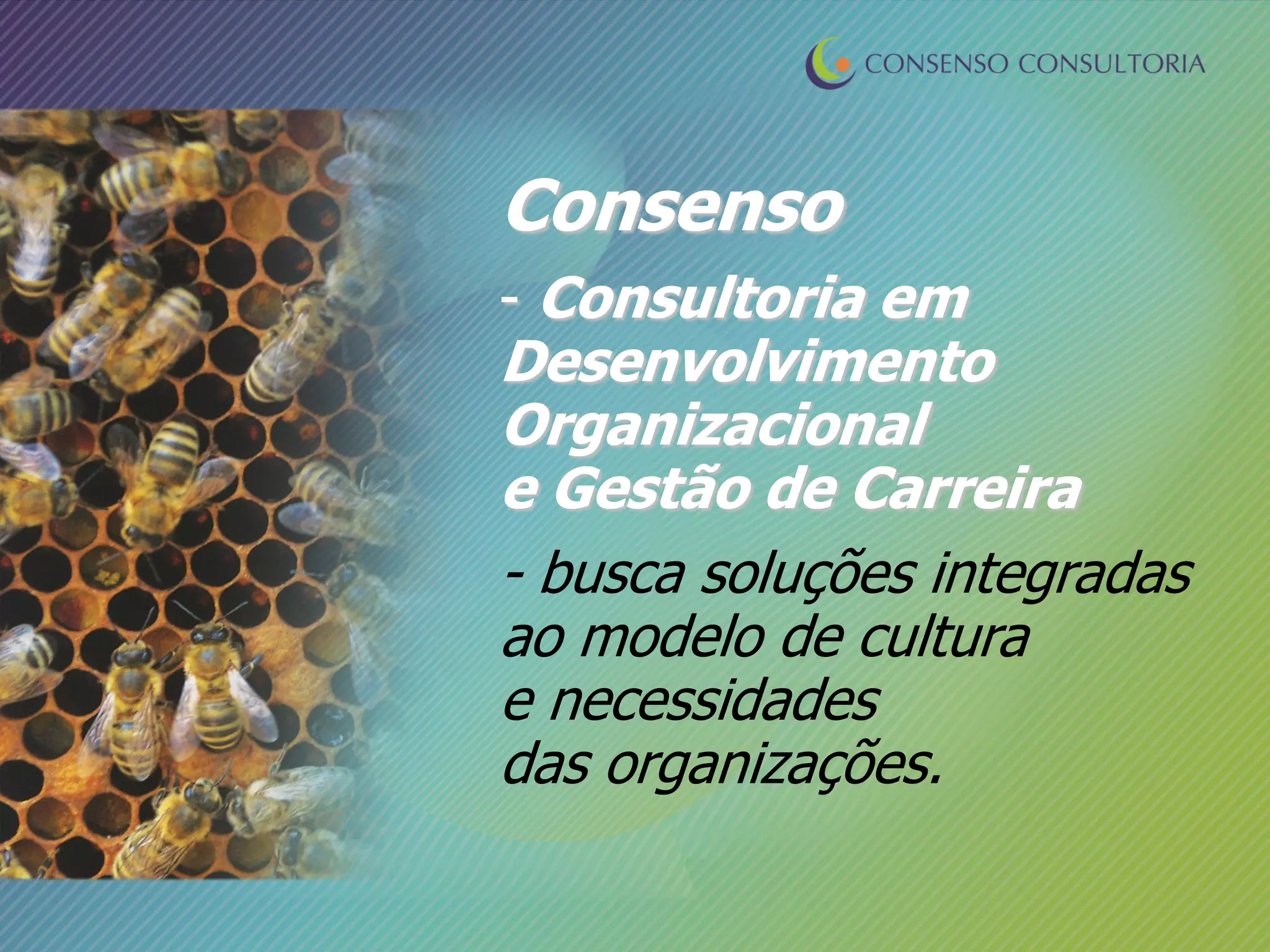 A consultoria oferece serviços de desenvolvimento organizacional e gestão de carreira, buscando soluções que estejam alinhadas com a cultura e necessidades de cada organização.