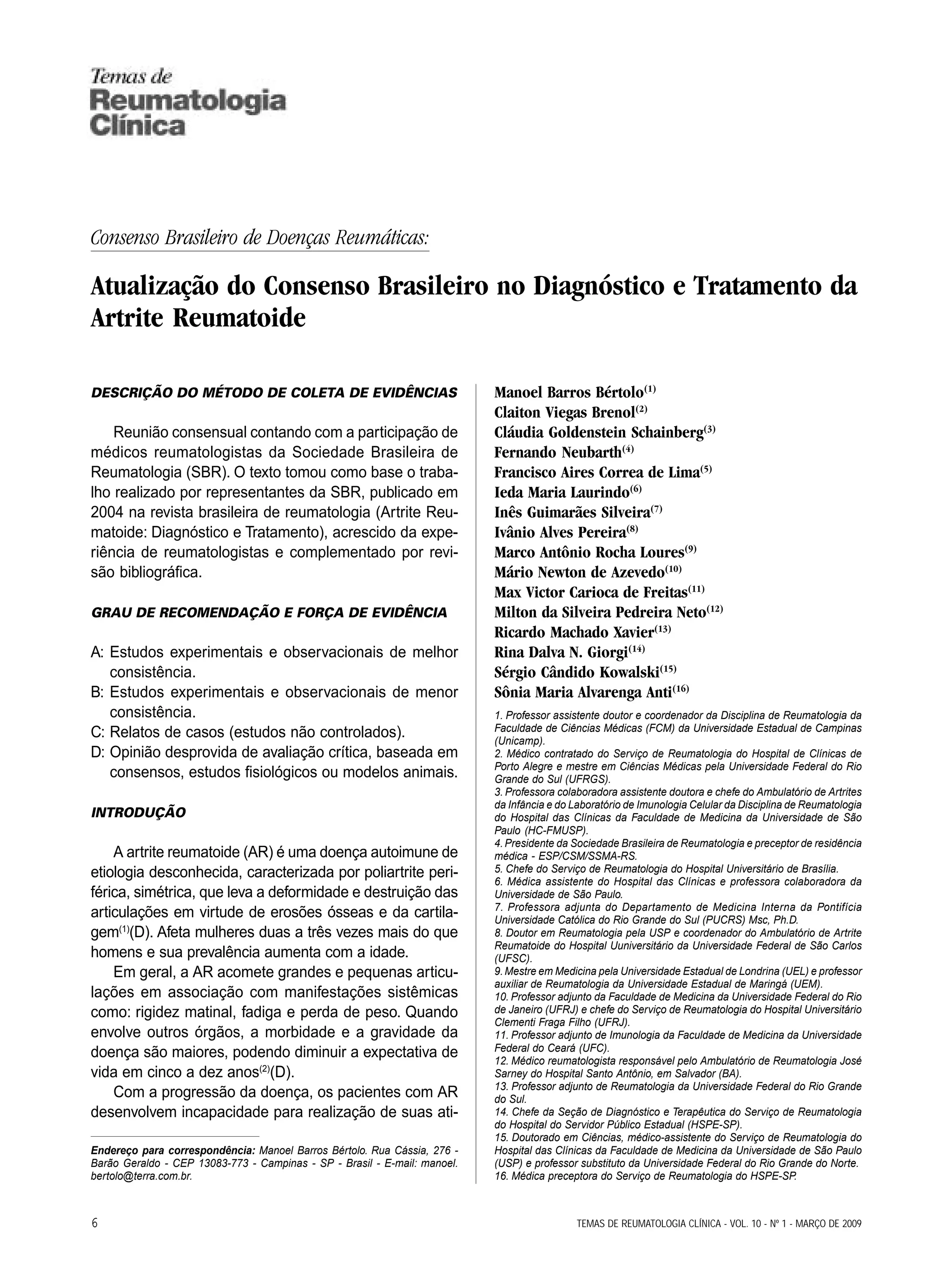 Este documento apresenta as diretrizes do Consenso Brasileiro de Doenças Reumáticas para o diagnóstico e tratamento da artrite reumatoide (AR). Ele descreve os critérios clínicos e laboratoriais para diagnóstico da AR e recomenda o início imediato do tratamento para prevenir danos articulares. O tratamento deve ter como objetivo controlar a inflamação, preservar a função e melhorar a qualidade de vida do paciente, utilizando medicamentos sintomáticos e modificadores da doença.