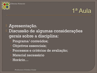 Este documento apresenta o plano de aulas de Ciências Naturais do 8o ano. O plano inclui os tópicos a serem ensinados sobre a Terra como um planeta com vida, os sistemas da Terra, a sustentabilidade e a gestão de recursos. O plano também descreve os objetivos, critérios de avaliação, material necessário e horário.