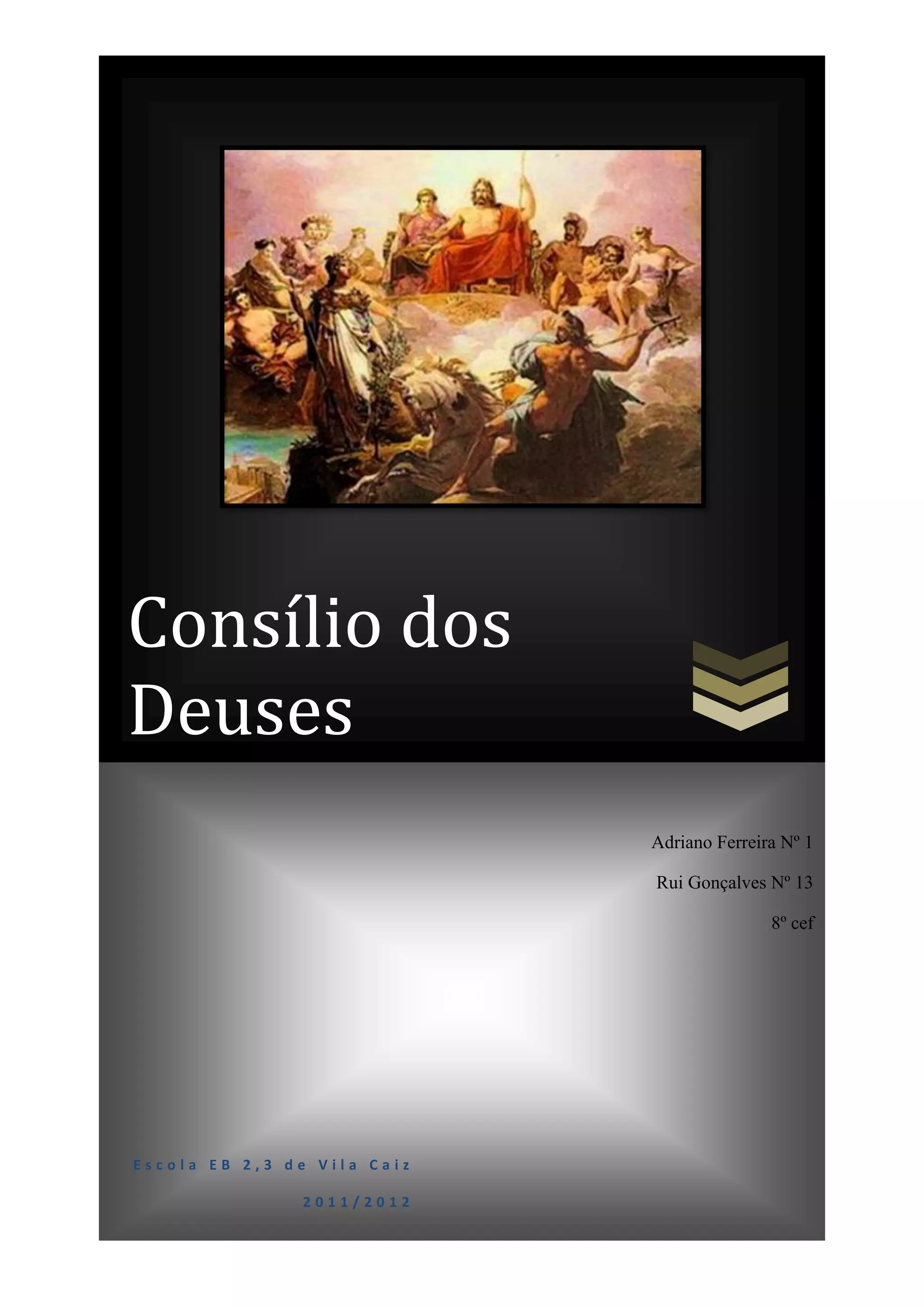 Este documento apresenta uma bibliografia de Luís de Camões, seguida de uma pequena entrevista fictícia com o poeta e uma análise do episódio "Consílio dos Deuses" de Os Lusíadas. O resumo inclui detalhes sobre a vida e obra de Camões, a decisão dos deuses em ajudar os portugueses em sua viagem para a Índia no episódio, e a estrutura formal das estrofes utilizadas.