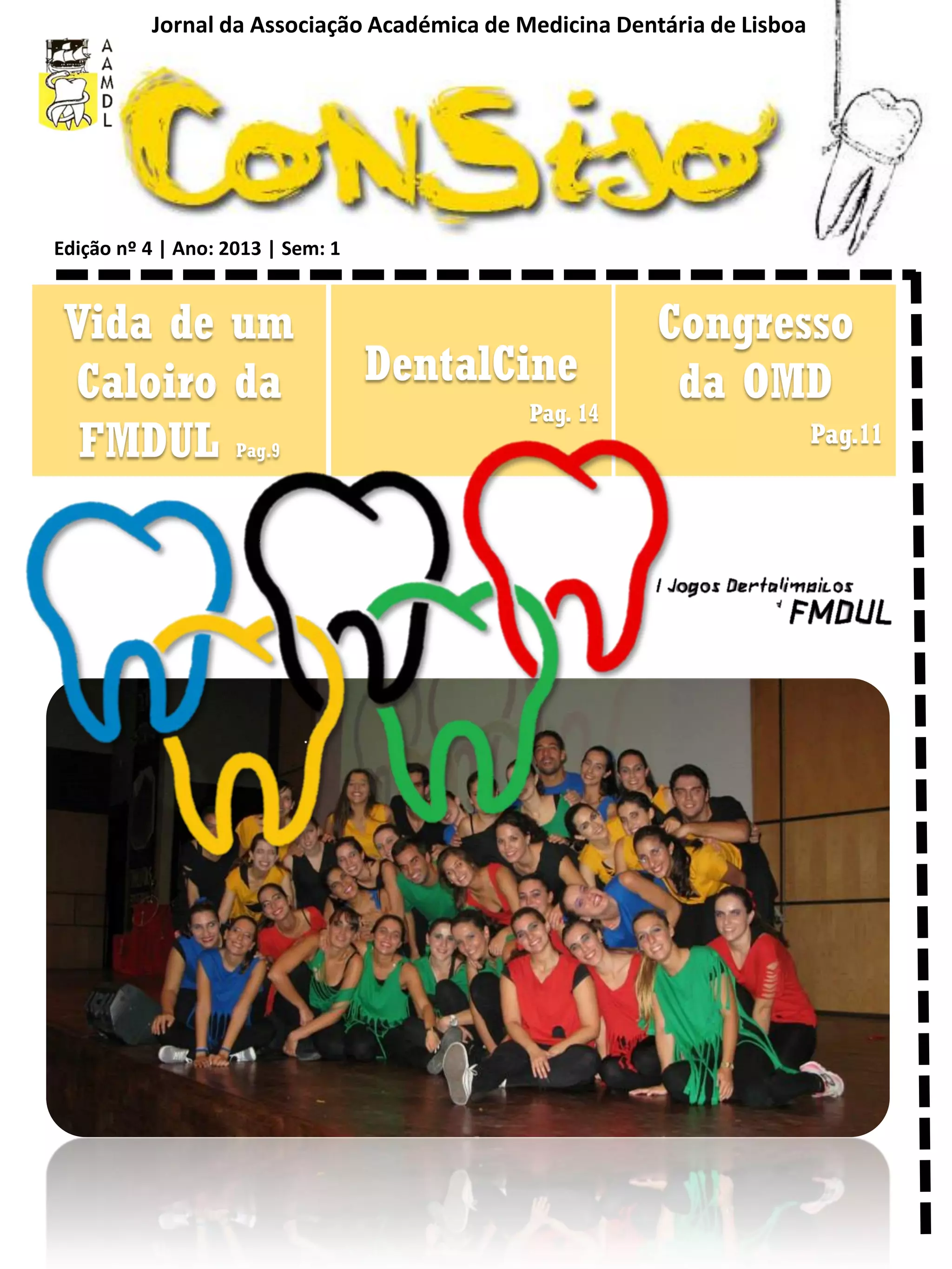 Este jornal da Associação Académica de Medicina Dentária de Lisboa contém 3 artigos principais: 1) Uma descrição da vida de um caloiro na Faculdade de Medicina Dentária de Lisboa, 2) Informações sobre o Congresso da Organização Mundial de Medicina Dentária, 3) Detalhes sobre o primeiro evento DentalCine que exibiu o filme "Django Livre" para os estudantes.