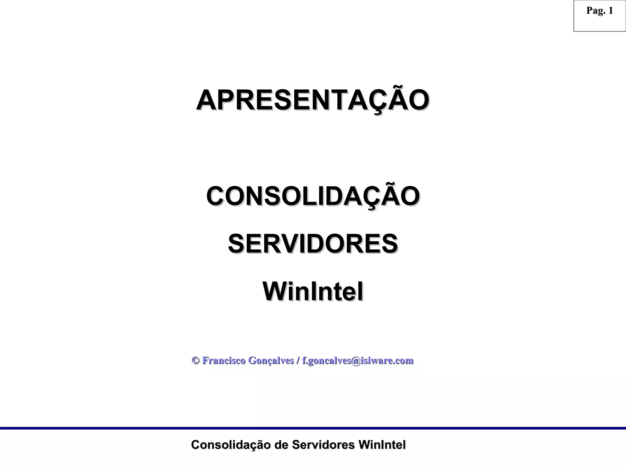 Este documento discute a consolidação de servidores Windows em ambientes corporativos. Atualmente, servidores são dispersos e dedicados a uma única aplicação, com configurações variadas de hardware e software e baixa redundância. A consolidação permite virtualizar vários sistemas operacionais em um único hardware, integrar infraestrutura em rede de armazenamento, reduzir custos e aumentar disponibilidade e recuperação de desastres.