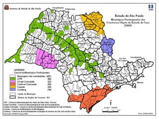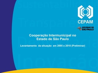Este documento descreve as formas de cooperação intermunicipal no estado de São Paulo em 2005 e 2010. Em 2005, os consórcios intermunicipais eram a forma mais comum de cooperação, com 116 consórcios envolvendo 83% dos municípios. Em 2010, o levantamento preliminar encontrou 106 consórcios, principalmente nas áreas de saúde, infraestrutura e meio ambiente.