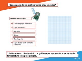 O documento fornece instruções para construção de um gráfico termo-pluviométrico, representando variação de temperatura e precipitação ao longo do ano. Inclui descrição dos materiais necessários, como traçar os eixos de temperatura e precipitação, plotar dados mensais, e calcular métricas como temperatura média anual e amplitude térmica. Fornece também exemplo para construir gráfico de Évora com dados de temperatura e precipitação mensais.