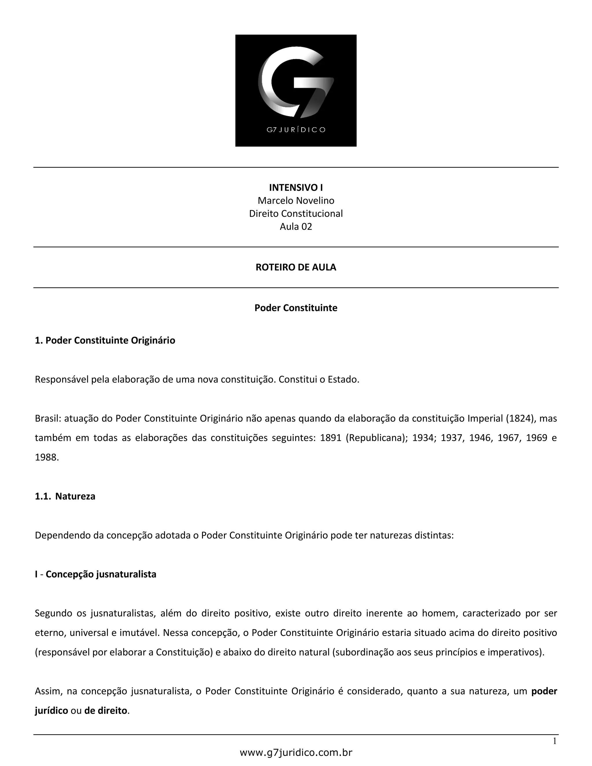 1) Poder Constituinte Originário, responsável por elaborar novas constituições. Pode ter natureza jurídica ou política.