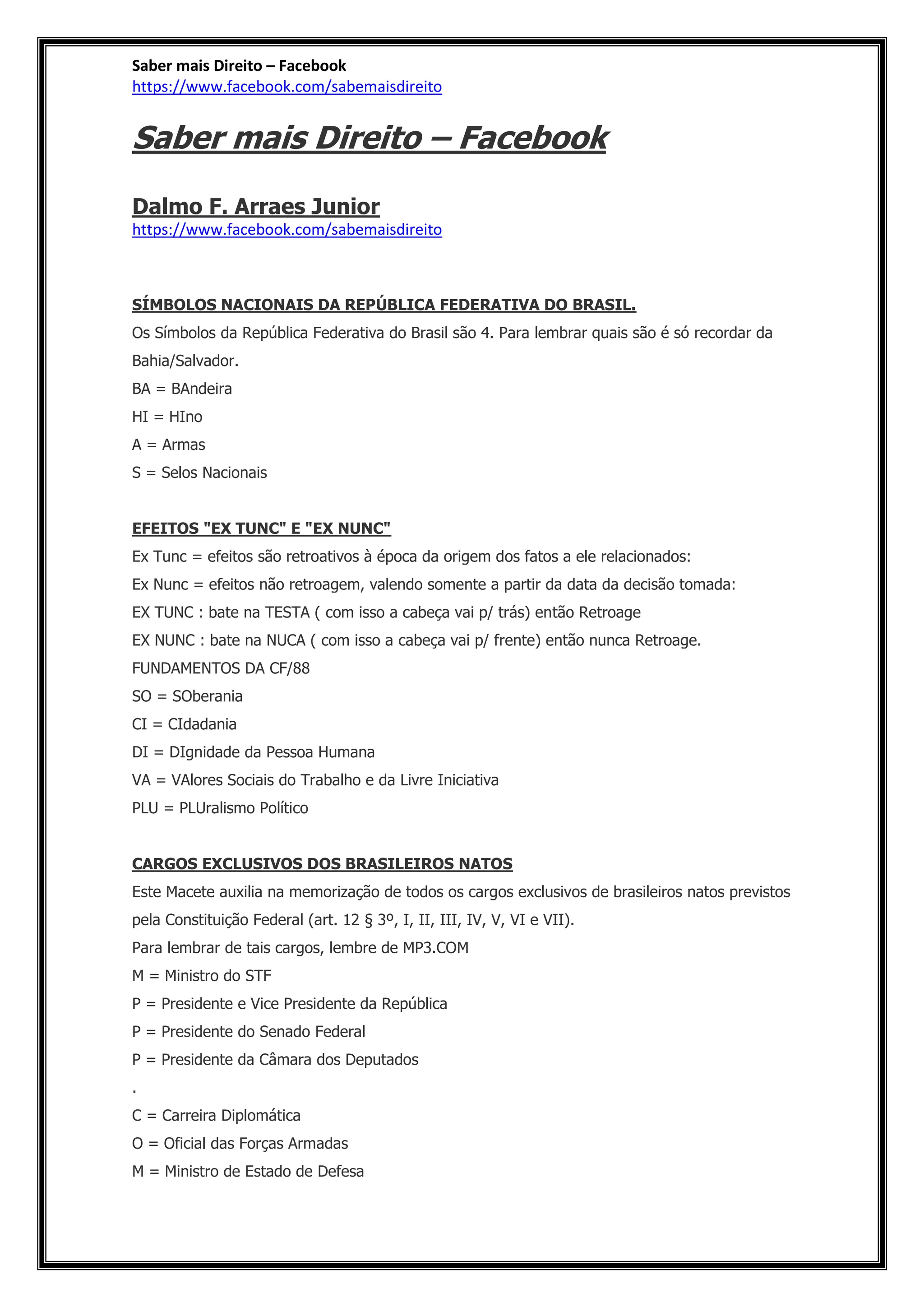 O documento apresenta vários macetes de memorização para direito constitucional brasileiro, incluindo símbolos nacionais, efeitos jurídicos, fundamentos da Constituição de 1988, cargos exclusivos para brasileiros natos, cláusulas pétreas, características dos direitos fundamentais, composição de tribunais, competências da União, Estados e Municípios, e classificação de constituições.
