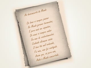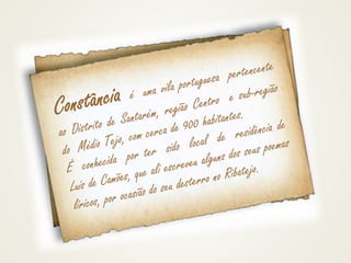 O documento descreve a vida e obra do poeta português Luís Vaz de Camões. Em três frases, resume que Camões nasceu em Coimbra ou Lisboa por volta de 1525, é autor do épico "Os Lusíadas" e considerado o maior poeta português, e faleceu em Lisboa em 1580 em absoluta pobreza, após ter viajado para a Índia e China e publicado seu obra-prima em 1572.