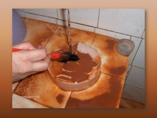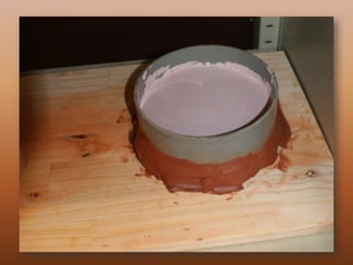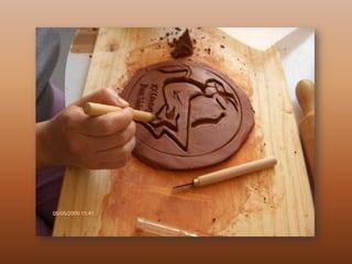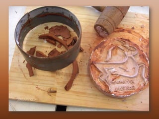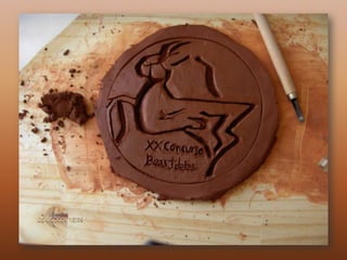 O documento descreve o processo de construção de um molde para uma medalha comemorativa em cinco etapas: 1) Construção de um molde em barro, 2) Transferência da imagem para o barro e talhagem dos elementos, 3) Colocação de uma forma cilíndrica e adição de gesso com óxido de ferro, 4) Criação do molde negativo a partir do positivo, pincelando-o com água e sabão e untando-o com óleo, 5) Aperfeiçoamento da peça resultante e aplicação de uma patine