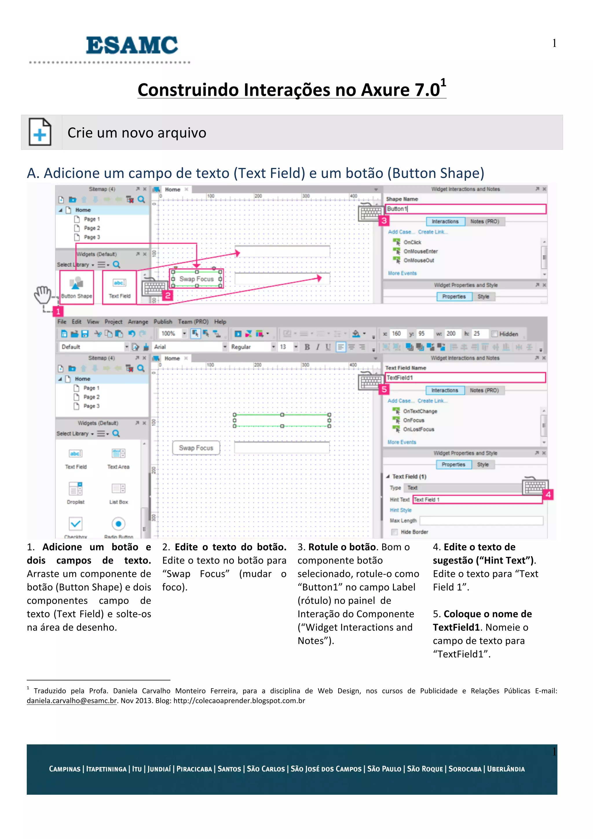 1. O documento ensina como criar interações básicas no Axure 7.01, incluindo adicionar campos de texto e botões, editar propriedades, criar eventos de clique e carregamento de página.