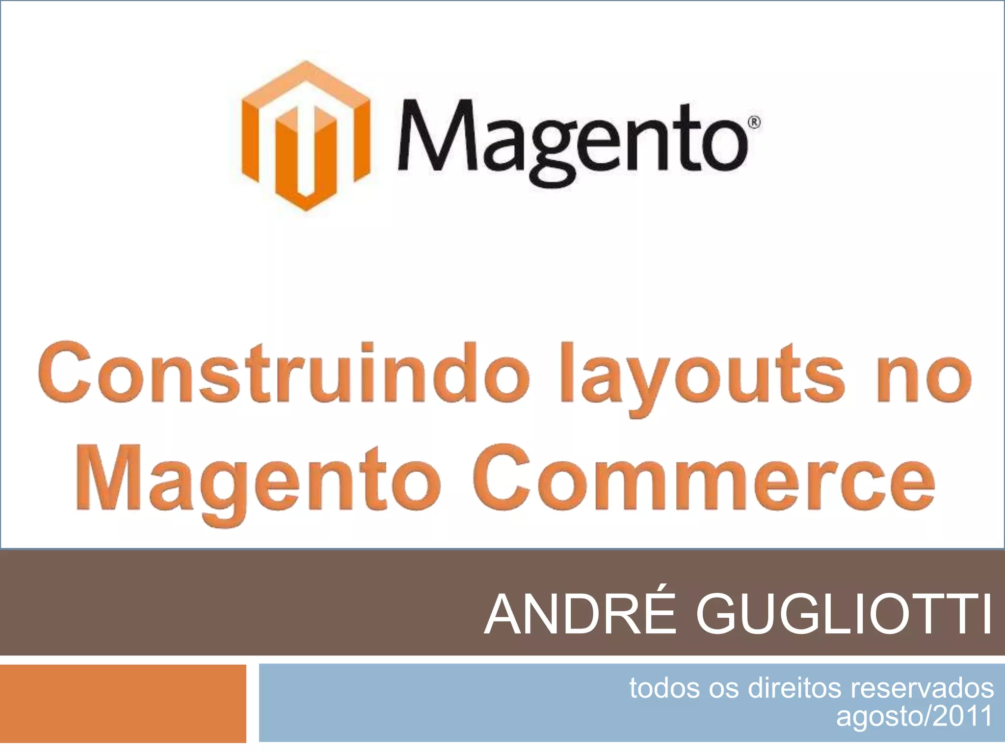 O documento discute a construção de layouts no Magento Commerce. Ele começa apresentando o palestrante e o que será abordado, incluindo uma introdução ao Magento e suas versões. Em seguida, explica a estrutura de lojas, temas personalizados, elementos de um tema e boas práticas para desenvolvimento. Por fim, discute requisitos para profissionais Magento e sugestões para estudar o framework.