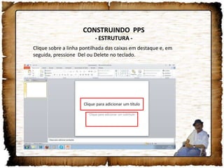 O documento fornece instruções passo a passo para construir uma apresentação no PowerPoint, começando com a abertura do aplicativo, limpeza da tela inicial, adição de 5 slides em branco e inserção de imagens nesses slides para criar a estrutura básica da apresentação.