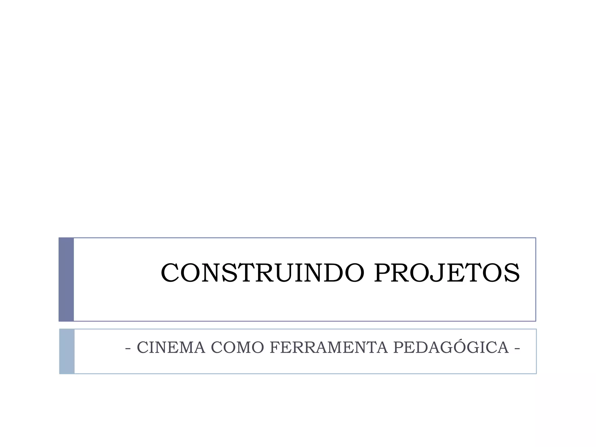 O documento discute as etapas para construção de projetos utilizando o cinema como ferramenta pedagógica. Ele aborda conceituação de projeto, público-alvo, duração, objetivos, escolha do filme, metodologia, e resultados esperados.