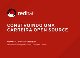 O documento discute como construir uma carreira em open source, dividida em 4 fases: descoberta, formação, acreditação e realização. Apresenta o percurso acadêmico e profissional do autor e mostra dados sobre a adoção de tecnologias open source por empresas, com 78% delas usando e 64% contribuindo para projetos open source. Recomenda fontes como a Red Hat para aprender mais sobre o assunto.