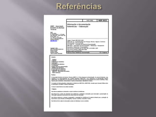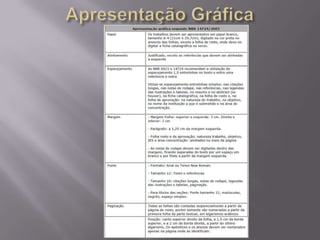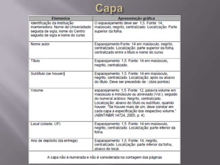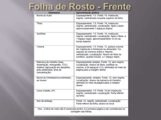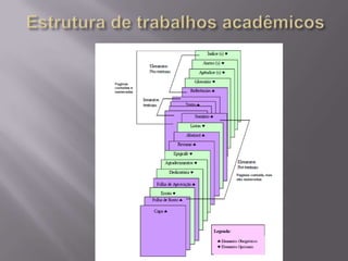 O documento fornece informações sobre como estruturar diferentes tipos de trabalhos acadêmicos, como TCC, monografia, dissertação e tese. Ele descreve os elementos obrigatórios e opcionais de cada tipo de trabalho, como introdução, materiais e métodos, resultados e discussão. Além disso, explica os elementos pré-textuais que antecedem o corpo do texto e a ficha catalográfica na parte posterior da folha de rosto.