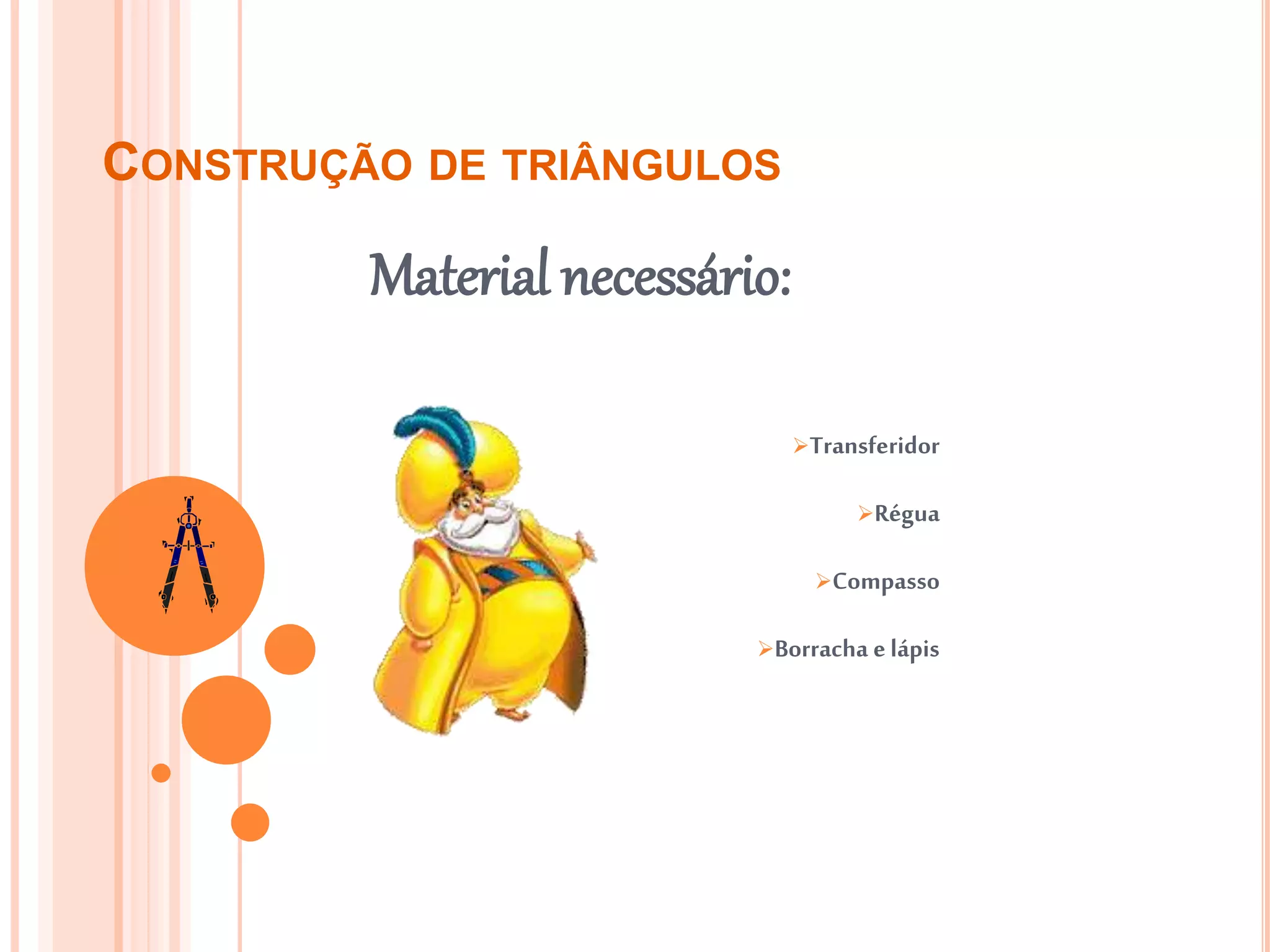 Este documento fornece instruções para construir triângulos a partir de diferentes informações: 1) comprimento dos três lados, 2) comprimento de dois lados e ângulo entre eles, 3) comprimento de um lado e ângulos adjacentes. Inclui verificação da viabilidade do triângulo e uso de transferidor, compasso e régua para traçar arcos e linhas.